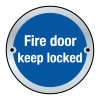 'Fire Door Keep Locked Shut' door sign is a 1.5mm thick satin anodised aluminium disc (75mm Dia.), complete with screw holes for easy application.