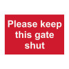 Please Keep This Gate Shut' sign is a 300mm x 200mm general site sign made from self-adhesive semi-rigid Polypropylene making it easy to apply to a clean dry surface. All our signs conform to the BS EN ISO 7010 regulation, ensuring that all graphical safety symbols are consistent and compliant.