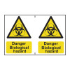 ‘Danger Biological Hazard’ sign is a 150mm x 200mm hazard warning sign. Featuring 2 on a sheet that can be cut into individual signs. Made from self-adhesive semi-rigid Polypropylene making it easy to apply to a clean dry surface. All our signs conform to the BS EN ISO 7010 regulation, ensuring that all graphical safety symbols are consistent and compliant.