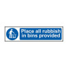 Place All Rubbish In Bins Provided' Sign is a 200mm x 50mm mandatory sign made from self-adhesive semi-rigid Polypropylene making it easy to apply to a clean dry surface. All our signs conform to the BS EN ISO 7010 regulation, ensuring that all graphical safety symbols are consistent and compliant.