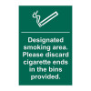 Designated Smoking Area. Please Discard Cigarette Ends' is a 200mm x 300mm sign made from self-adhesive semi-rigid Polypropylene making it easy to apply to a clean dry surface. All our signs conform to the BS EN ISO 7010 regulation, ensuring that all graphical safety symbols are consistent and compliant.