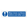 Wipe Down Surfaces Before And After Use' sign is a 200 x 50mm mandatory sign made from self-adhesive semi-rigid Polypropylene making it easy to apply to a clean dry surface. All our signs conform to the BS EN ISO 7010 regulation, ensuring that all graphical safety symbols are consistent and compliant.